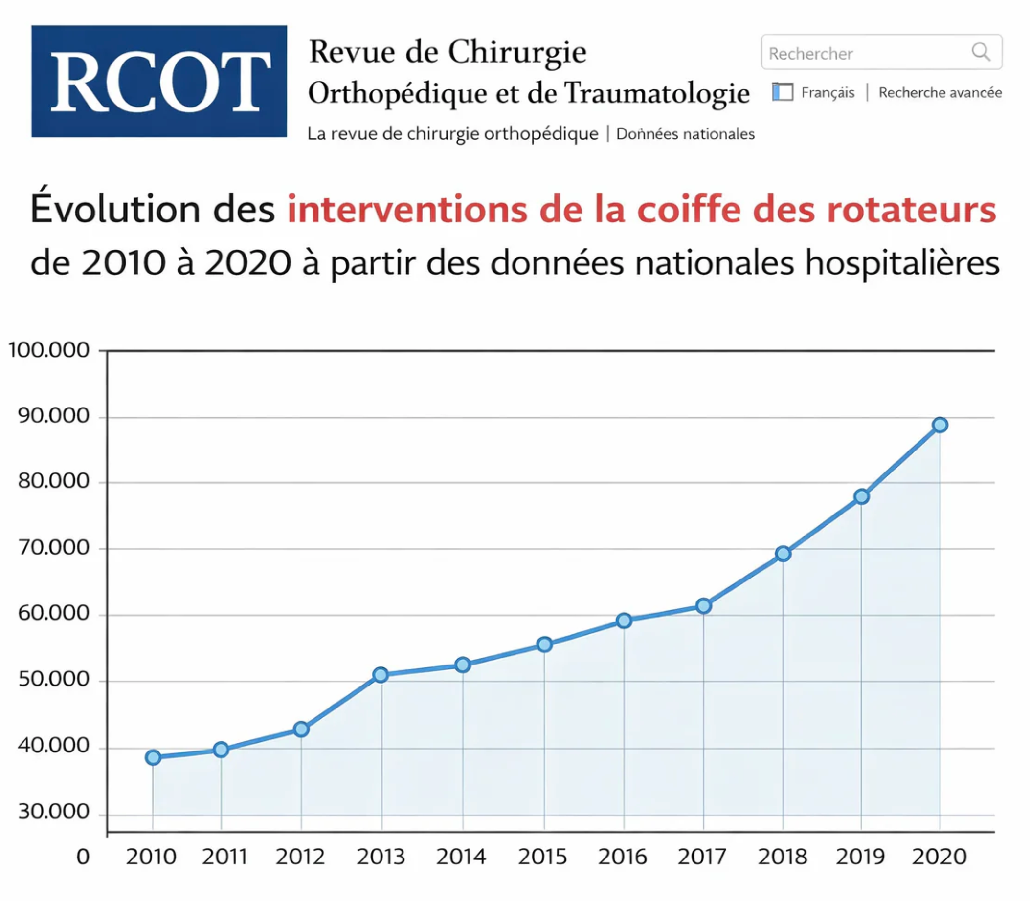 En France, le nombre d'opérations de la coiffe des rotateurs a augmenté de 24,5 % entre 2012 et 2018. Plus de 60 000 interventions par an.