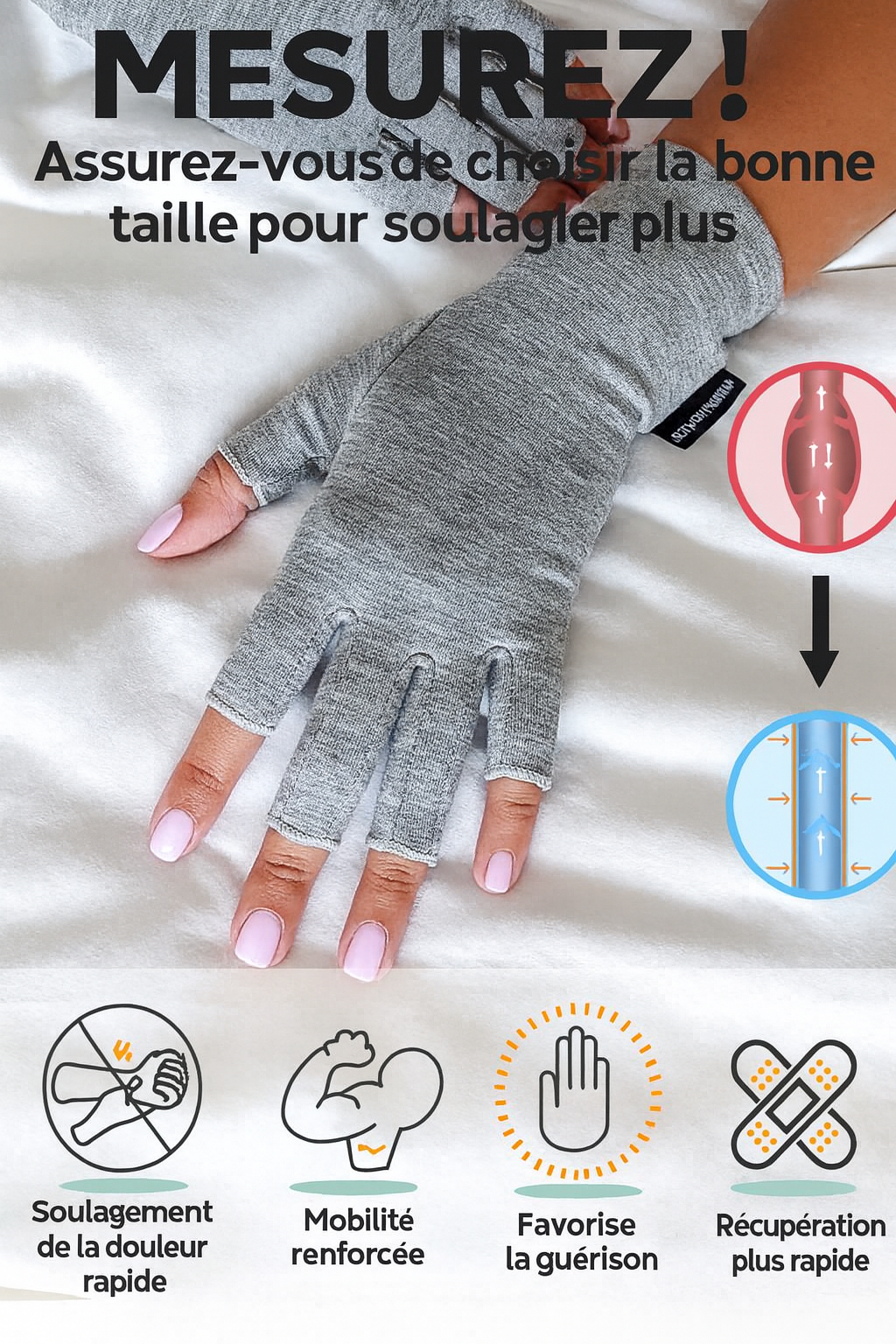 • Ces gants aident à soulager la douleur dans mes doigts arthritiques. Ils n'arrêtent pas tout, mais si je les porte pour dormir, ce n'est pas aussi grave le matin, et je les porte aussi pendant la journée quand mes doigts me font mal.