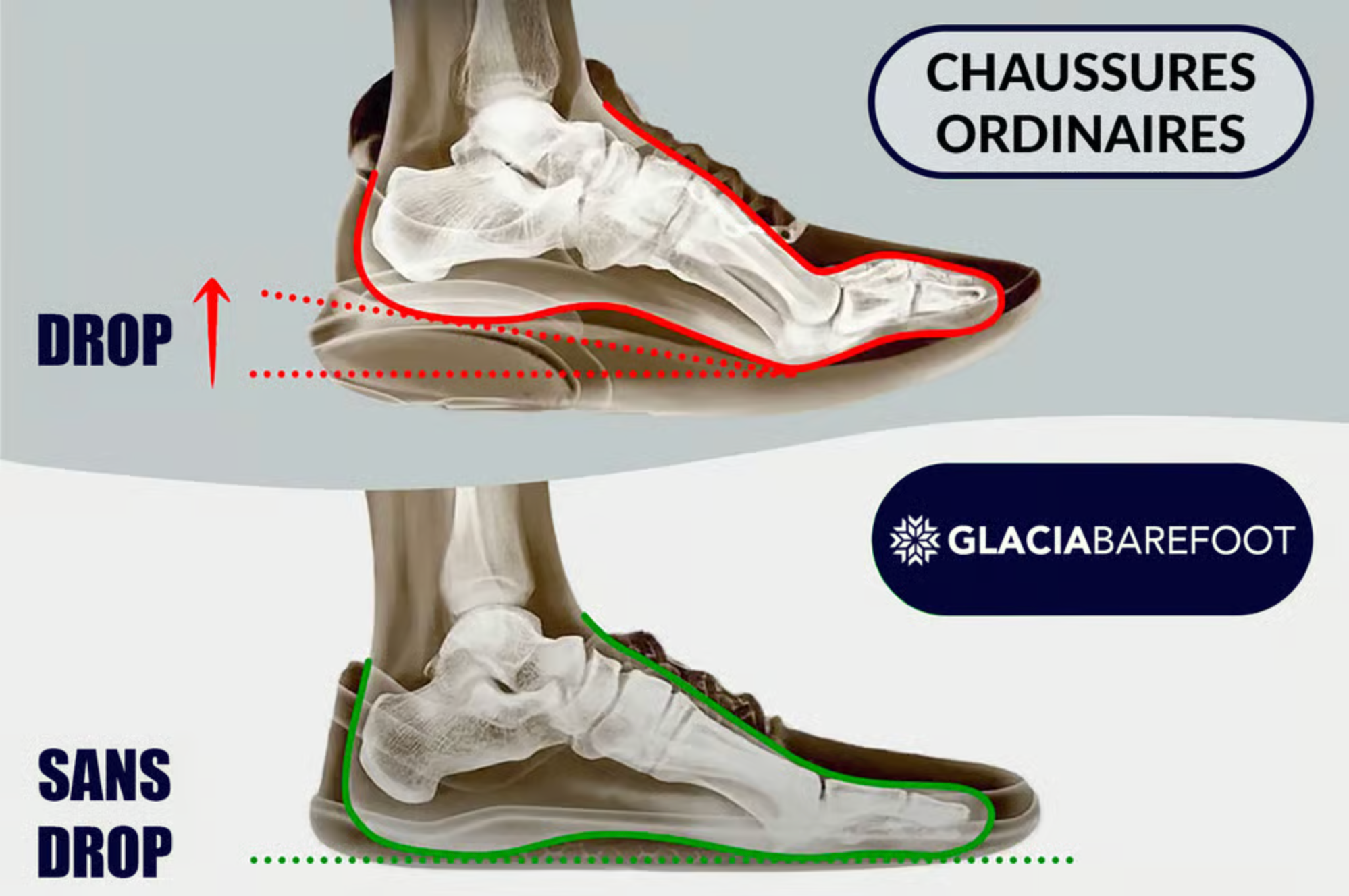 Les chaussures Glacia Barefoot sont conçues sans drop, ce qui signifie que le talon et l’avant du pied sont parfaitement alignés. Cette caractéristique unique favorise une posture naturelle et équilibre le poids de votre corps de manière homogène.